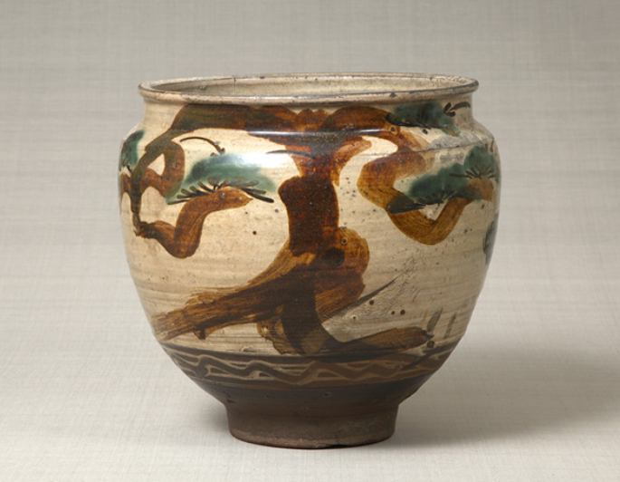 Storage jar with pine motif and iron and copper green glaze over white slip from late 17th century